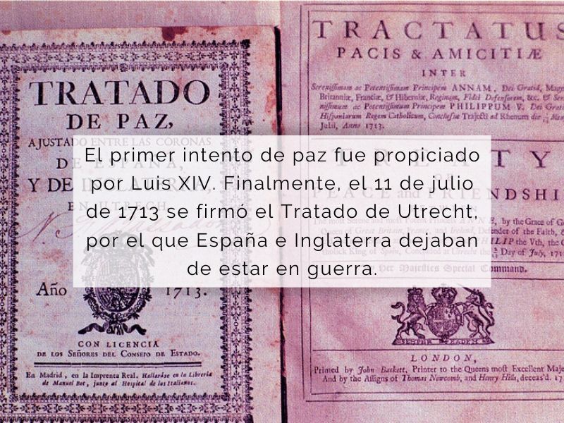 El 13 de julio de ese mismo año se ratifica el acuerdo de paz entre España y Gran Bretaña. Tras la firma del Tratado, Felipe V fue reconocido como rey de España y sus Indias pero, a cambio, renunció a los derechos al trono de Francia y cesión de los Países Bajos al emperador Carlos VI, pretendiente al trono español.